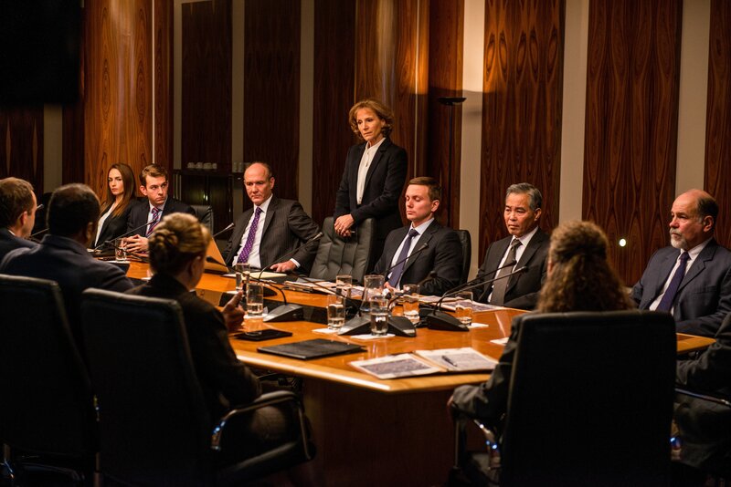 Hinter, l-r: Deputy Chief Mason (Jackie Earle Haley), Director Ray Monroe (Sean O'Bryan), Vizepräsident Trumbull (Morgan Freeman), Verteidigungsminister Ruth McMillan (Melissa Leo).Bild: © ORF