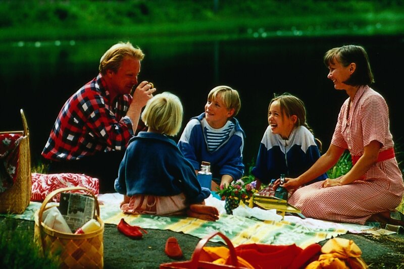 V.li.n.re.: Mama (Beatrice Järas), Mia (Linn Gloppestad), Jonas (Martin Andersson), Lotta (Grete Havnesköld) und Papa (Claes Malmberg) machen einen Ausflug.Bild: © Iduna Film