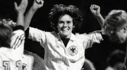 Birgit Dahlke beim Torjubel im ersten Länderspiel gegen Schweiz 1982.Bild: © rbb/Picture Alliance