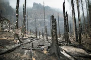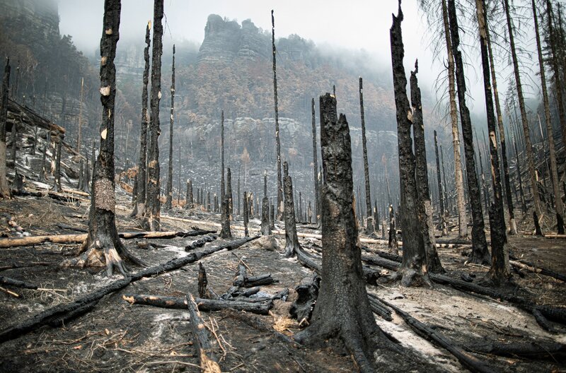 Im Sommer 2022 wüteten wochenlang verheerende Waldbrände im Elbsandsteingebirge. Riesige Flächen im Herz im Herz des Nationalparks wurden zerstört. Zurüch blieb eine leblose, scheinbar apokalytische Welt.Bild: © NDR/Science Vision