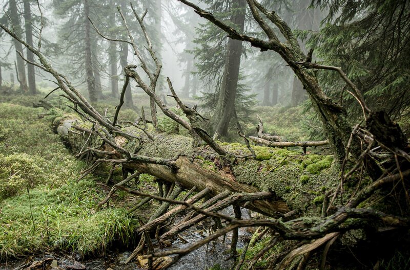 Das Innere des Jeseniky Urwaldes erinnert an eine Welt aus einer fernen Zeit. Knorrige alte Bäume ragen hoch auf, nur vereinzelt treffen Lichtstrahlen auf den Boden, der dicht mit Moos und Farnen bewachsen ist.Bild: © NDR/Science Vision