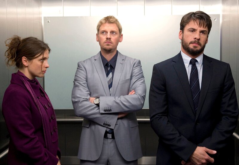 Eine kurz Fahrt mit dem Fahrstuhl kann verdammt lange sein: Lina (Julia Brendler) mit ihrem Freund Daniel (Martin Gruber, Mitte) und ihrer großen Liebe Markus (Stephan Luca).Bild: © ARD Degeto/Erika Hauri