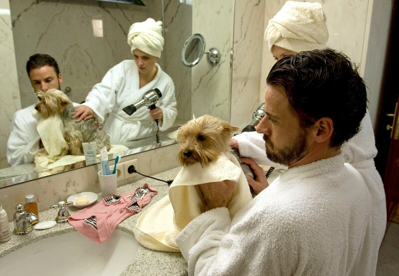 Lina (Julia Brendler) und Markus (Stephan Luca) versuchen fieberhaft, den Hund des Millionärs Hofmeister nach seinem kleinen Schlammbad wieder vorzeigbar zu machen.Bild: © ARD Degeto/Erika Hauri