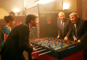 Das vermeintliche "Ehepaar" Lina (Julia Brendler) und Markus (Stephan Luca) tritt zu einem Kicker-Turnier gegen Klinikchef Prof. Weissing (Robert Giggenbach, 2.v.r.) und den wichtigen Sponsor Hofmeister (Heinz Hoenig, re.) an.Bild: © ARD Degeto/Erika Hauri