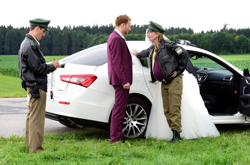 Am bestem gleich kehrt machen! Maria (Lisa Maria Potthoff, re.) spricht Klartext mit dem Fahrer (Maximilian Dir) der Braut. Kollege Michi (Matthias Ransberger) notiert die Vergehen.Bild: © ARD Degeto/Goldkind/Jürgen Olczyk