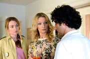 Niemand soll merken, dass Maria Moosandl (Lisa Maria Potthoff) von Rocco (Serkan Kaya) ein Kind erwartet – ihre Stiefmutter Irmi (Monika Gruber, 2.v. r.) und die Bürgermeistergattin Uscha (Sabrina Khalil, li.) schon gar nicht.Bild: © ARD Degeto/Goldkind/Jürgen Olczyk
