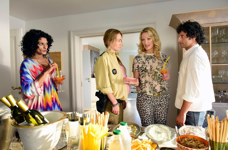 Maria (Lisa Maria Potthoff) verschweigt ihrer Stiefmutter Irmi (Monika Gruber, 2.v. re.), dass Rocco (Serkan Kaya) der heimliche Vater ist.Bild: © ARD Degeto/Goldkind/Jürgen Olczyk
