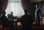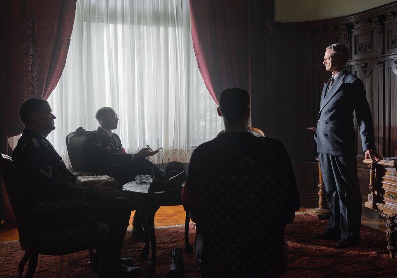 Louis Nathaniel Rothschild (Alexander E. Fennon) wird im Wiener Hotel Metropole von den Nazis gefangen gehalten. Heinrich Himmler (David Jakob, 2. v. l.) erpresst ihn um sein Vermögen.Bild: © ORF/Metafilm/Helmut Wimmer