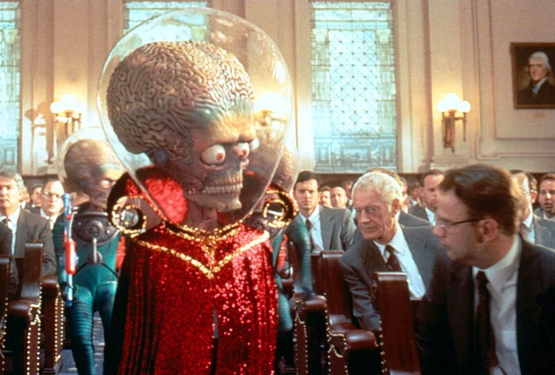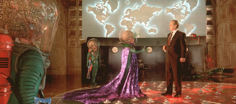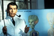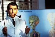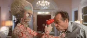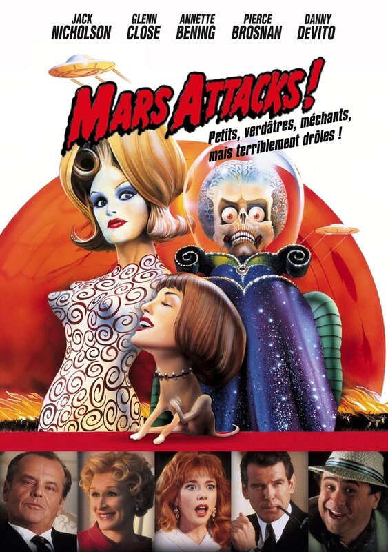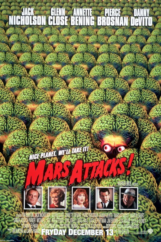 Mit "Mars Attacks!" gelang Kultfilm-Regisseur Tim Burton ("Batman", "Sweeney Todd", "Alice im Wunderland") der mit Abstand wohl durchgeknallteste und bizarrste Sci-Fi-Film der 90er-Jahre. Das bewusst trashige und knallbunte Meisterwerk verhöhnt mit großem Genuss und einer unglaublichen Dichte an herausragenden Einfällen alles, was in Filmen wie "Independence Day" todernst genommen wurde. Burtons "Independence Day auf Camp-Niveau" (film-dienst) ist eine Art Hommage auf die hinreißend naiven Sci-Fi-Filme der 50er- und 60er-Jahre, deren erklärter Fan Burton schon immer war. Die Vorlage für den Film lieferten übrigens bunte Sammelbildchen, die in den 60er-Jahren einer beliebten Kaugummimarke in den USA beigelegt waren und nach einiger Zeit wegen ihrer "gewalttätigen" Darstellungen verboten wurden. Nicht nur die gewohnt skurrilen Handlungsideen des Gespanns Burton (Regie) und Jonathan Gems (Drehbuch) und die brillanten Spezialeffekte und Animationen der großköpfigen Marsianer ließen "Mars Attacks!" zu einem absoluten Kultfilm avancieren, auch die herausragende Besetzung, die Burton für sein Projekt gewinnen konnte, hatte enormen Anteil an der Klasse des Films. Neben Jack Nicholson in der Doppelrolle des entscheidungsunfähigen Präsidenten Dale und des versoffenen Immobilienhais Art Land, Glenn Close in der Rolle der ignoranten Präsidentengattin und Ex-"James Bond"-Star Pierce Brosnan als begeistertem und unverbesserlichen Ufologen brillieren - teils in kleinen, aber feinen Rollen - u. a. Annette Bening (grandios als spinnerte Esoterikerin!), Sarah Jessica Parker, Martin Short, Danny DeVito, Michael J. Fox, Rod Steiger und Kult-Entertainer Tom Jones, der sich natürlich selbst spielt. Auch Pam Grier, Jack Black und "Kelly Bundy" Christina Applegate spielen kleine Parts in "Mars Attacks!" Schließlich darf auch der kongeniale Score von Burtons "Hauskomponist" Danny Elfman nicht unerwähnt bleiben, der bereits Filme wie "Batman", "Nightmare Before Christmas", "Sleepy Hollow", "Big Fish" oder "Dark Shadows" mit seinen unnachahmlichen Kompositionen veredelte.