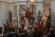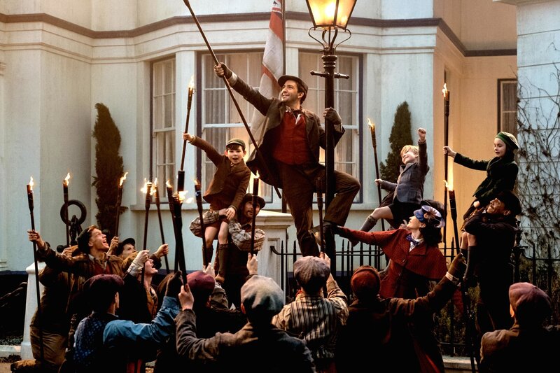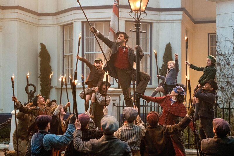 Jack (Lin-Manuel Miranda) Mary Poppins (Emily Blunt) und die Banks-Kinder mit einer Besatzung von Straßenlampenscheinwerfern in der Cherry Tree Lane 17Bild: © Jay Maidment