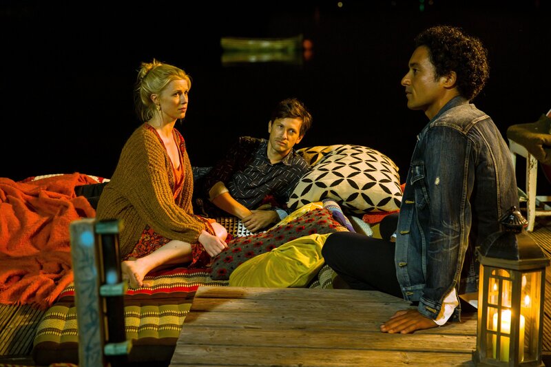 Charlotte (Christine Eixenberger, l.), Noah (Franz Dinda, M.) und Hakim (Omar El-Saeidi, r.) sitzen nachts auf Charlottes Hausboot.Bild: © ZDF und Daniela Incoronato