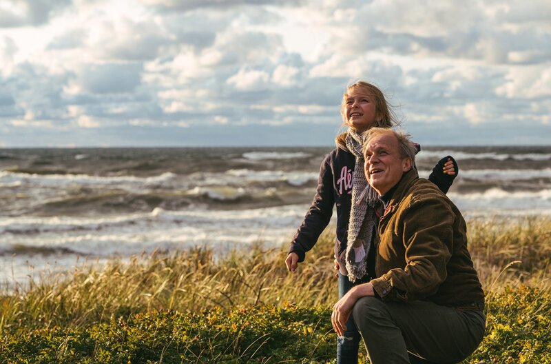 Lebensfreude: Thomas Wintersperger (Ulrich Tukur, r.) mit Max' Enkelin beim Drachensteigen an der Ostsee.Bild: © WDR/KJ Entertainment/Lukas Salna