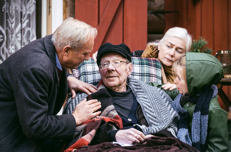 Schwächeanfall: der rüstige, streitbare Kauz Max (Hans-Peter Korff, M.) mit seinem neuen Freund Thomas Wintersperger (Ulrich Tukur, l), seiner Enkelin und einer Nachbarin.Bild: © WDR/KJ Entertainment/Lukas Salna