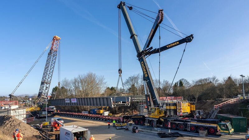 Bei Flensburg muss eine Eisenbahnbrücke über eine vierspurige Bundesstraße gelegt werden. Sie ist aus Stahl, 46 Meter lang, acht Meter breit, über drei Meter hoch und wiegt 267 Tonnen. Dafür werden zwei Mobilkrane benötigt. Sie sind über 100 Tonnen schwer und können bis zu 1.000 Tonnen heben. Doch diese extremen Gewichtheber müssen erst einmal selber aufgebaut werden, dazu bringen Schwertransporte die Einzelteile der Krane an die Baustellen. Die Reportage zeigt deren Aufbau und Einsatz.