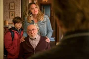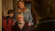 Nachdem Hintz (Dieter Hallervorden, M.) die Türschlösser ausgewechselt hat, schaffen es Trixie (Alwara Höfels, r.) und ihr Sohn Sean (Lior Kudrjawizki, l.) mit einer List und mithilfe der Polizei wieder in die Wohnung.Bild: © 3sat
