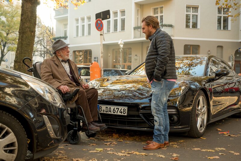 Hintz (Dieter Hallervorden, l.) wäre beinahe angefahren worden und streitet sich mit dem Autofahrer (Axel Stein, r.).Bild: © 3sat