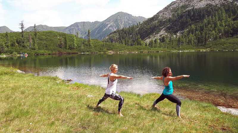 Marlies Raich mit Sandra König beim Yoga am Reedsee im GasteinertalBild: © ORF