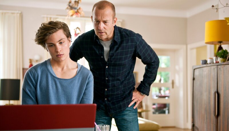 Tobias (Heino Ferch) und sein Sohn Finn (Jannik Schümann) schaut sich auf Dating-Portalen im Internet um.Bild: © HR/Degeto/Britta Krehl