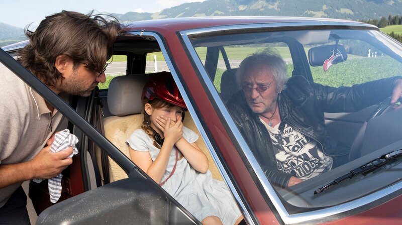 Abenteuer-Trip: Hartmut (Günther Maria Halmer, re.) nimmt Nikos (Adam Bousdoukos, li.) und seine Tochter Marie (Panka Simon, Mitte) mit.Bild: © ARD Degeto/Kerstin Stelter