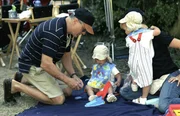 Greg (Ben Stiller, Mitte) versucht sich mit seinem Vater Bernie (Dusin Hoffman, li.) und dem strengen Jack (Robert De Niro, re.) an einem Football-Turnier.