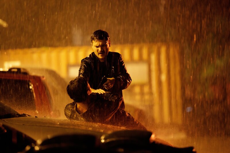 Nach der Observierung einer Bar und einer anschließenden wilden Verfolgung stellt der Polizist Byron Crawford (Emile Hirsch, r.) im strömenden Regen einen Verdächtigen (Komparse, l.).Bild: © Kenneth Rexach / ZDF