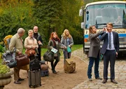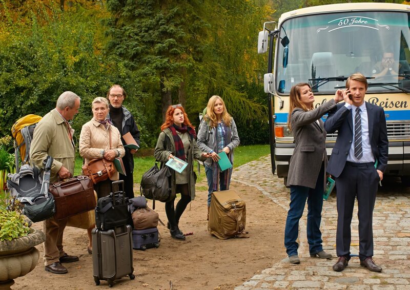 Die Ankunft am Seminarort (von links nach rechts): Herbert (Walter Kreye) und seine Frau Gudrun (Jutta Speidel), Alfred (Martin Brambach), die Smartphone-süchtige Rosa (Paula Kalenberg), Silvia (Stefanie Stappenbeck, Therapeutin (Birge Schade) und Workaholic Johann (Max von Pufendorf).