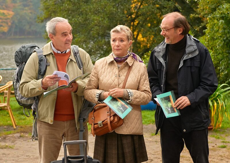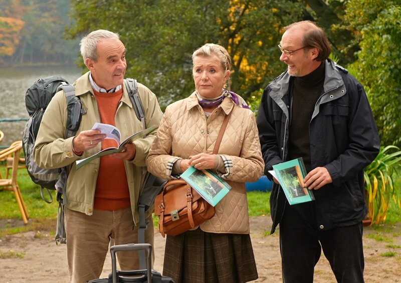 MDR Fernsehen MIT BURNOUT DURCH DEN WALD, am Sonntag (03.05.15) um 22:20 Uhr. Herbert (Walter Kreye, li.), seine Frau Gudrun (Jutta Speidel) und Alfred (Martin Brambach) bei der Ankunft am Seminarort.