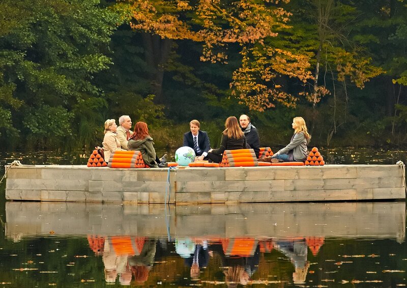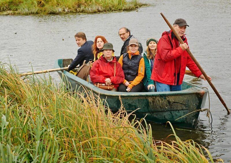NDR Fernsehen MIT BURNOUT DURCH DEN WALD, am Donnerstag (23.10.14) um 22:00 Uhr. Die Gruppe macht sich mit einem herrenlosen Boot auf die Weiterfahrt: Johann (Max von Pufendorf), Rosa (Paula Kalenberg), Gudrun (Jutta Speidel), Alfred (Martin Brambach), Therapeutin (Birge Schade), Silvia (Stefanie Stappenbeck) und Herbert (Walter Kreye).
