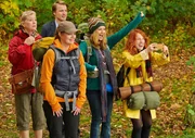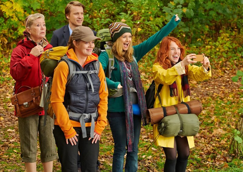MDR Fernsehen MIT BURNOUT DURCH DEN WALD, am Sonntag (03.05.15) um 22:20 Uhr. Die Ankunft am Seminarort (von links nach rechts): Herbert (Walter Kreye) und seine Frau Gudrun (Jutta Speidel), Alfred (Martin Brambach), die Smartphone-süchtige Rosa (Paula Kalenberg), Silvia (Stefanie Stappenbeck, Therapeutin (Birge Schade) und Workaholic Johann (Max von Pufendorf).