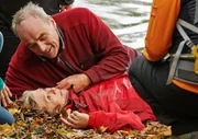 NDR Fernsehen MIT BURNOUT DURCH DEN WALD, am Donnerstag (23.10.14) um 22:00 Uhr. Gudrun (Jutta Speidel) ist über ihren Schatten gesprungen und im Wasser gelandet, ihr Mann Herbert (Walter Kreye) beugt sich über sie.