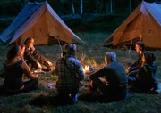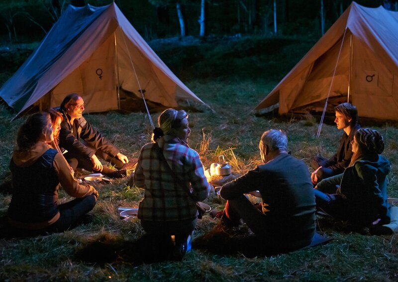 Die Gruppe muss auf Anweisung von Therapeutin (Birge Schade, l.) eine Nacht im Freien verbringen: Rosa (Paula Kalenberg), Alfred (Martin Brambach), Gudrun (Jutta Speidel, 4. v. re.), Herbert (Walter Kreye, 3. v. r.), Johann (Max von Pufendorf) und Silvia (Stefanie Stappenbeck, r.).