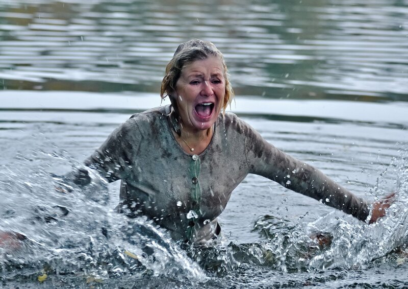 rbb Fernsehen MIT BURNOUT DURCH DEN WALD, am Donnerstag (29.01.15) um 20:15 Uhr. Gudrun (Jutta Speidel) ist über ihren Schatten gesprungen und im Wasser gelandet, ihr Mann Herbert (Walter Kreye) beugt sich über sie.