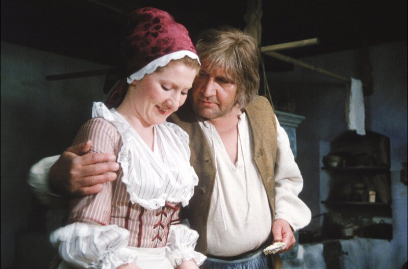 Die hinterhältige Dorotka (Jaroslava Kretschmerová, links) heiratet den verwitweten alten Müller František Máchal (František Vicena, rechts) aus purer Habgier und treibt ihn vorsätzlich in den Tod.