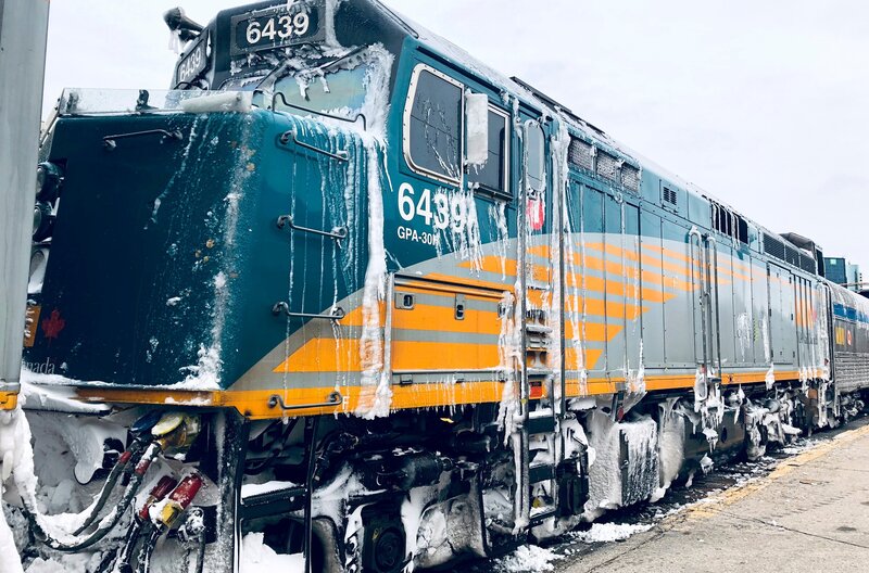 Verschneite Lok des Zuges "The Canadian" bei der Ankunft in Winnipeg, der Hauptstadt der kanadischen Provinz Manitoba.Bild: © HR/Markus Cebulla