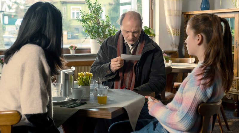 Im Vereinsheim versucht Ronnie (Martin Brambach, re.) die versäumte Zeit mit Tochter Tamara (Kotbong Yang, Mitte) und Enkelin Leonie (Mathilda Joung, li.) aufzuholen.Bild: © ARD Degeto Film/Conny Klein