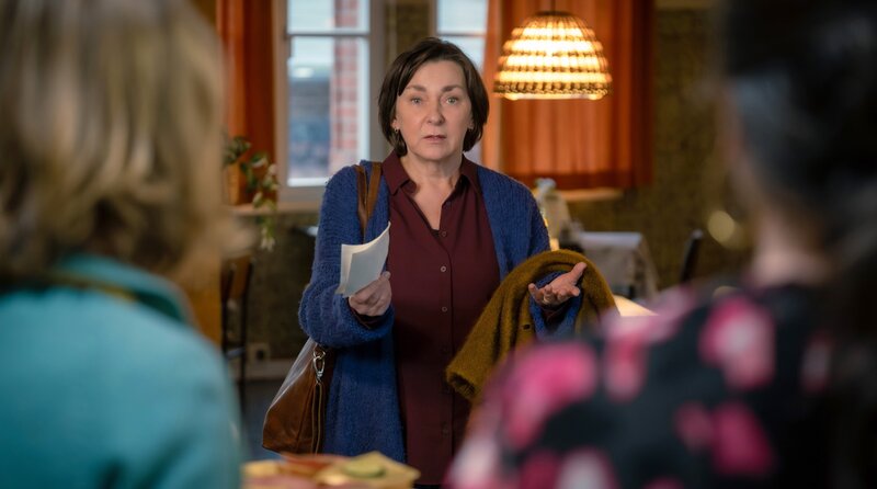 Hilde (Steffi Kühnert) berichtet ihren Freundinnen und Partnerinnen vom Stress mit dem Finanzamt.Bild: © ARD Degeto Film/Conny Klein