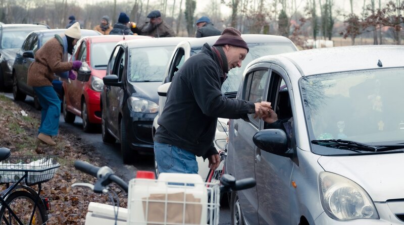 „Hilde To Go“: Ronnie (Martin Brambach, vorne.) und Tamara (Kotbong Yang, hinten) verteilen mit fleißigen Helfern Essen und heiße Getränke an die im Stau stehenden Autofahrer.Bild: © ARD Degeto Film/Conny Klein