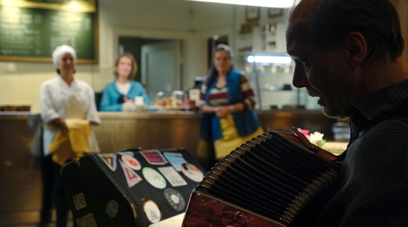 Feierabend in „Hildes Kantine“: Ronnie (Martin Brambach, vorne re.) spielt für die Damen Akkordeon.Bild: © ARD Degeto Film/Conny Klein