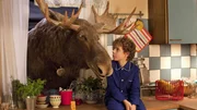 Der gestrandete Elch Moos steckt seinen Kopf durch das Küchenfenster, um mit Max (Dennis Reinsma) plaudern zu können.Bild: © KiKA/2013 Lemming Film BV, AB Svensk Filmindustri, Davaj Film, Filmpool Nord, Anchorage Entertainment/Victor Arnolds