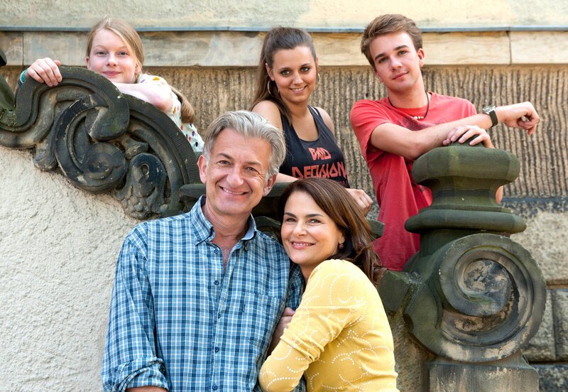 Eine Bilderbuchfamilie: Frauenarzt Stefan (Dominic Raacke, vorne li.), seine Frau Judith (Barbara Auer, vorne re.) und ihre Kinder Mona (Stefanie Amarell, hi. li.), Cosima (Hannah Valentin, hi. Mitte) und Ben (Johannes Gäde, re.). Weiteres Bildmaterial finden Sie unter www.br-foto.de.
