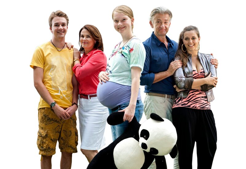 Die 14-jährige Mona (Stefanie Amarell) ist schwanger – und erhält von ihren Eltern Stefan (Dominic Raacke, 2. v. r.) und Judith (Barbara Auer, 2. v. li.) sowie ihren Geschwistern Cosima (Hannah Valentin, re.) Ben (Johannes Gäde, li.) jede Menge Unterstützung