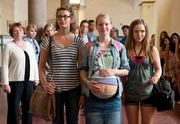 hr-fernsehen MONA KRIEGT EIN BABY, Spielfilm, Deutschland 2014, Regie: Ben Verbong, am Montag (09.03.15) um 21:00 Uhr. Unterstützt von ihren besten Freundinnen Jessica (Luisa Strunk, li.) und Hannah (Marija Mauer, re.) präsentiert Mona (Stefanie Amarell) stolz ihren schwangeren Bauch – sehr zum Unmut von Direktorin Schmelcher (Imogen Kogge, li. außen)
