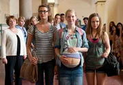 Unterstützt von ihren besten Freundinnen Jessica (Luisa Strunk, links) und Hannah (Marija Mauer, rechts) präsentiert Mona (Stephanie Amarell) stolz ihren schwangeren Bauch - sehr zum Unmut von Direktorin Schmelcher (Imogen Kogge, links außen) .