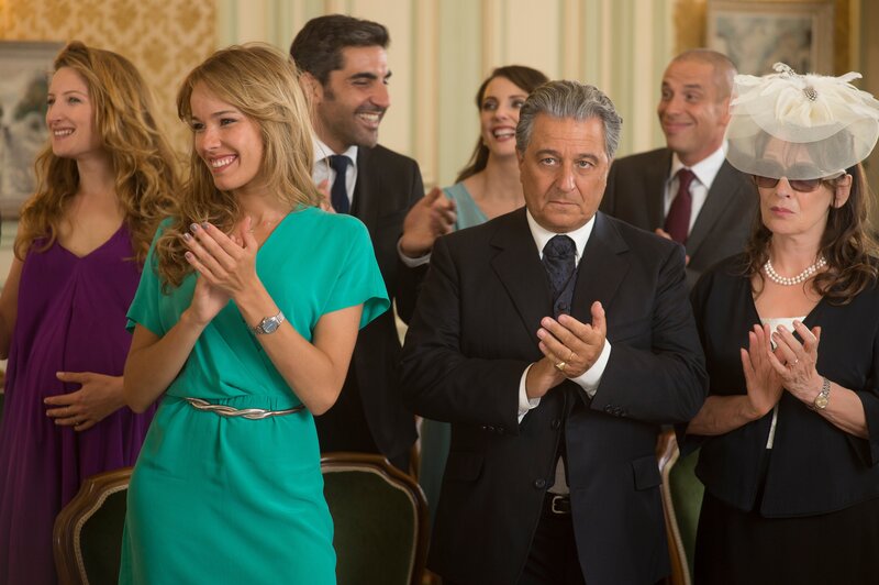 Monsieur Claude (Christian Clavier) und Ehefrau Marie Verneuil (Chantal Lauby, re.) müssen nur noch Laure (Élodie Fontan, 2. v. li.) unter die Haube bringen. Odile (Julia Piaton, hinten li.) ist David (Ary Abittan, hinten 2. v. li.) verheiratet, Rachid (Medi Sadoun, hinten re.) der Mann von Isabelle (Frédérique Bel).Bild: © A BORREL