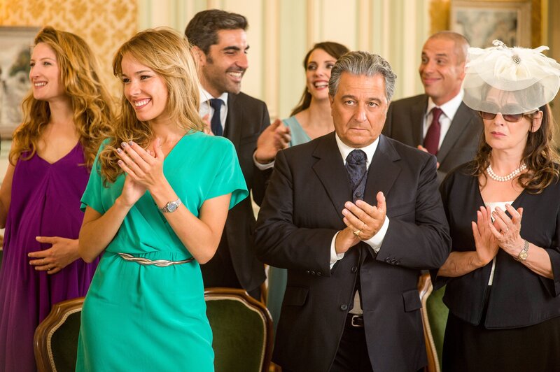 Claude (Christian Clavier, 2.v.r.) und Marie Verneuil (Chantal Lauby, r.) sind ein wohlhabendes, konservatives Ehepaar, das sich nichts sehnlicher wünscht, als dass die vier Töchter, Odile (Julia Piaton, l.), Laure (Élodie Fontan, 2.v.l.), Isabelle und Ségolène katholische, französische Männer heiraten. Doch drei von ihnen angeln sich Nicht-Katholiken, während die Jüngste sich zwar einen Katholiken anlacht, der aber dem Schwiegervater in spe auch nicht passt ...Bild: © PLURIMEDIA (Arnaud Borrel / UGC Distribution)
