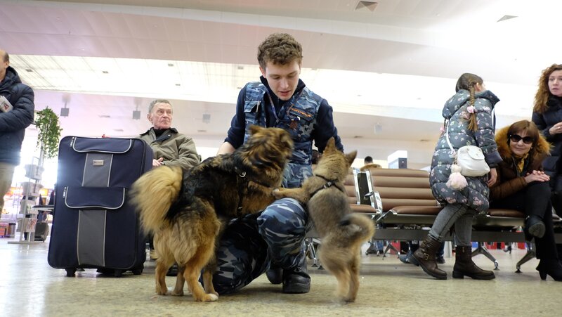 Am Moskauer Flughafen Scheremetjewo arbeitet eine ganz besondere Spürhund-Staffel: Mischlinge aus Schakal und arktischem Herden-Laika.Bild: © ARTE / MedienKontor/Yuri Burak