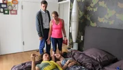Florian (Max von Thun, li.), seine Mutter Helga (Eleonore Weisgerber, 2. v. li.), und seine beiden Kinder Sarah (Alexandra von Giese, li.) und Leon (Yanis Scheurer, re.) sind nicht begeistert über Mias (Mira Bartuschek) Idee, Polizistin zu werden. Wer schmeißt dann den Haushalt?Bild: © ARD Degeto/Marco Orlando Pichler