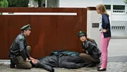 Die beiden herbeigerufenen Polizisten (links: Golo Euler, rechts: Amanda da Gloria) sind verblüfft: Mia (Mira Bartuschek, re.) hat ganz alleine einen Einbrecher überwältigt.Bild: © SWR/ARD Degeto/Marco Orlando Pichler
