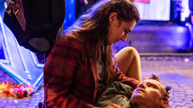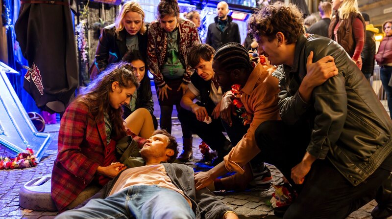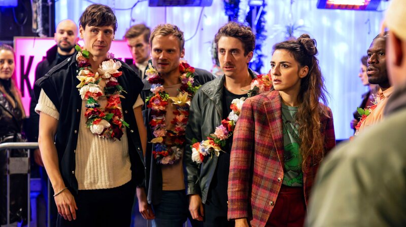 Vor der Karaokebar verteidigt Mely (Seyneb Saleh, re.) den Freund von Volker (Frank Casali, 2. v. re.), Paul (Anton Spieker, 2. v. li.) und Christian (Nicolò Pasetti, li.) vor einem Nazi.