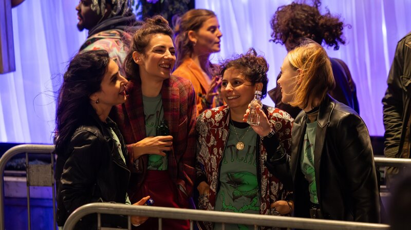 Mely (Seyneb Saleh, 2. v. li.) wird von ihren Freundinnen Julia (Katharina Hintzen, re.), Vitória (Vespa Vasic, 2. v. re.) und Aylin (Aylin Öcal, l.) mit einem Junggesellinnenabschied überrascht.